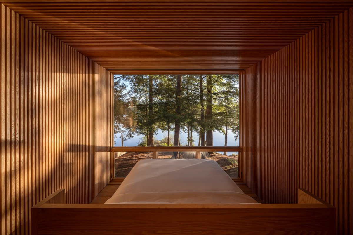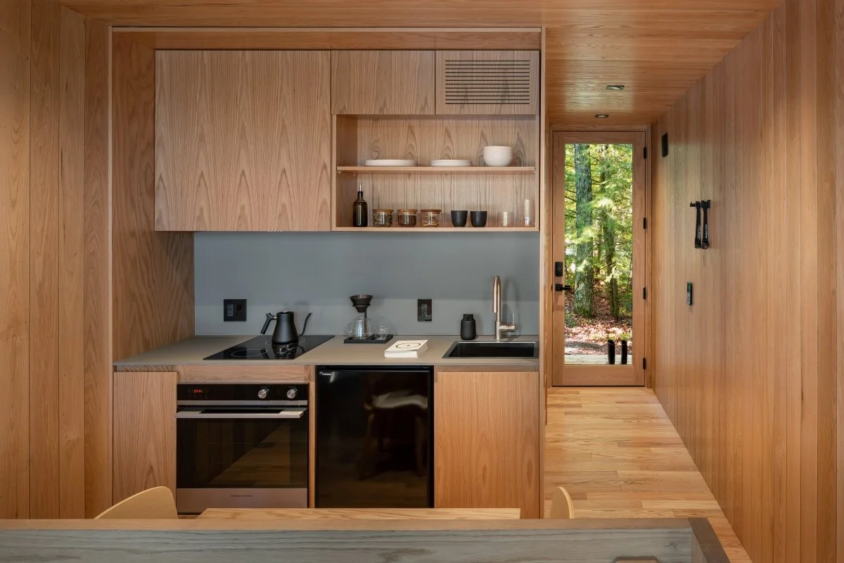 arhome interiors are thoughtfully designed with every detail crafted to harmonize with the natural beauty just beyond your doorstep. A picture window frames the view, and a deliberate absence of side windows to ensure. Inside, experience floor to ceiling red oak interiors and Fenix counters, combining elegance with durability.